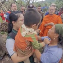Villagers in Mae Faek District of Chiang Mai went into a panic on Tuesday when a two year old boy named Copter was wandering around an orchard with his family when he suddenly disappeared. Dozens of rescue workers and volunteers immediately came to the rescue, spanning out five kilometres to search for the missing toddler. A scuba unit was also deployed to dive into the nearby pond.