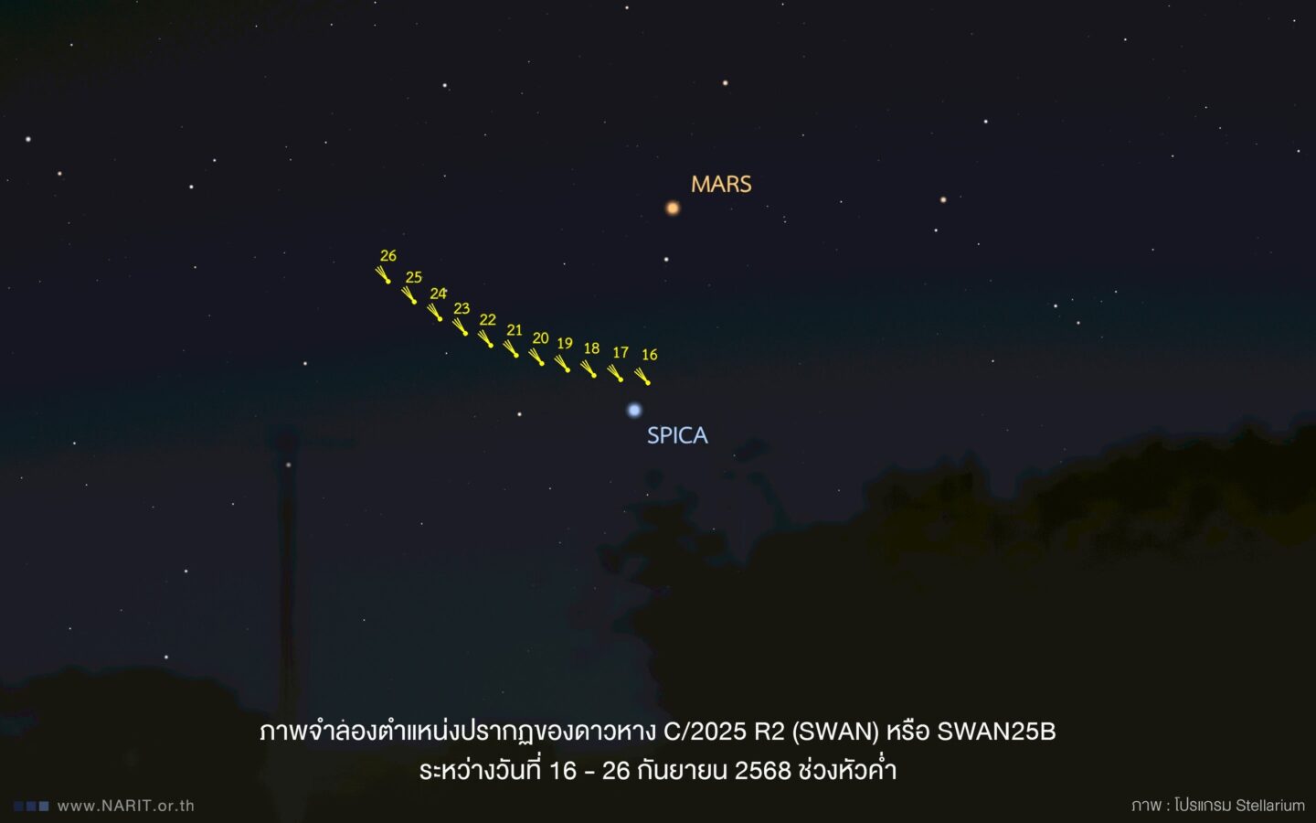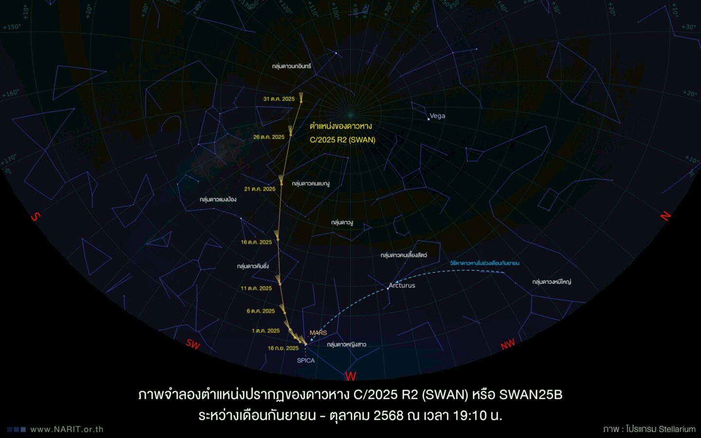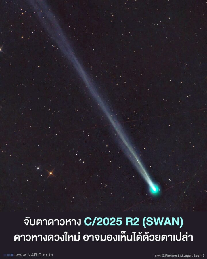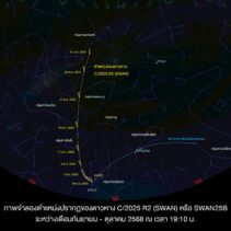 The National Astronomical Research Institute of Thailand (NARIT) and the Ministry of Higher Education, Science, Research and Innovation (MHESI) have introduced a newly discovered comet, C/2025 R2 (SWAN), or SWAN25B. It can be observed using binoculars or telescopes in the western sky from early evening until 7.50 pm.