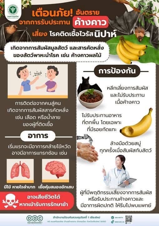 Dr. Waranyu Jamnongprasatporn, Chiang Mai Provincial Public Health Officer, said India has confirmed five Nipah virus cases, including three new cases reported in the past week, prompting Indian authorities to quarantine and monitor more than 180 close contacts in West Bengal and step up surveillance measures.