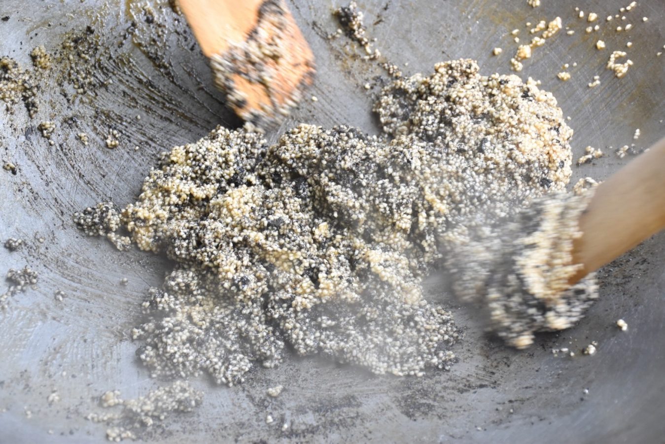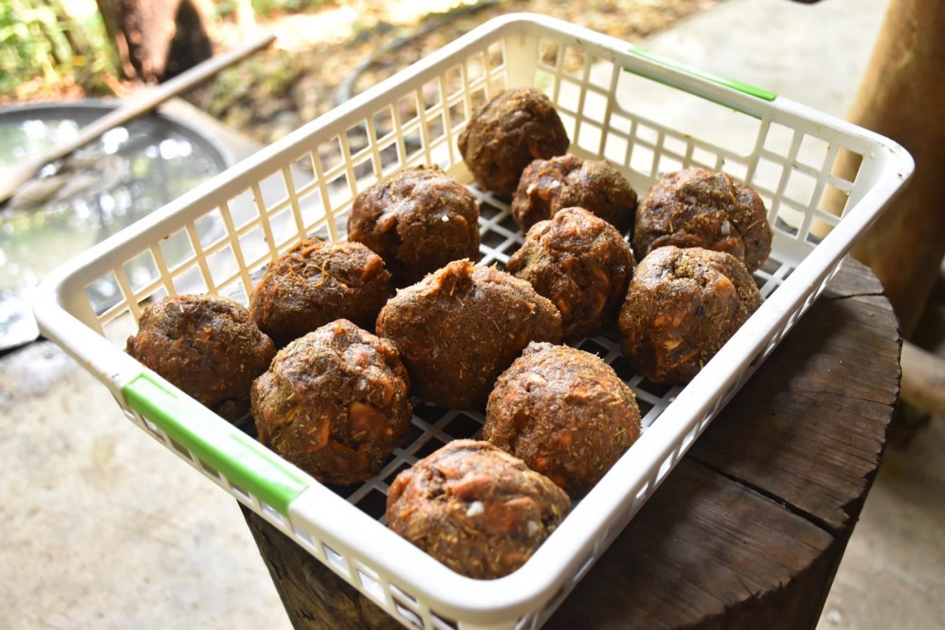 Learning and cooking for older elephants by thoroughly spinning the grass.graze a bucket to feed an elderly elephant