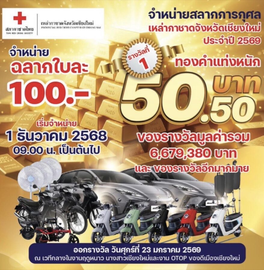 Chiang Mai’s annual charity Red Cross lottery is once again drawing excitement, with this year’s top prize causing an even bigger stir than usual. In previous years, major prizes included a house with land and a townhome, but this year’s first prize is a 50.50 baht gold bar worth more than 3.1 million baht — a highly coveted reward among punters, especially given gold’s rapidly rising value! More than 300 additional prizes are also on offer, including electric cars, electric motorcycles and other environmentally themed rewards.