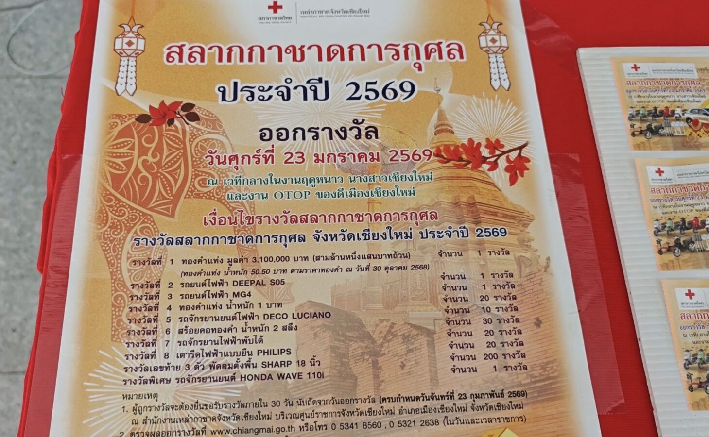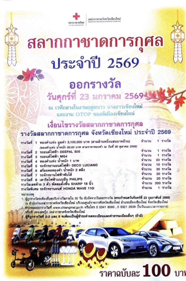 Another portion of tickets is being reserved for sale at the province’s annual Winter Fair, running from 9th-23rd January 2026. Online sales are available via the “Chiang Mai Red Cross Online Lottery 2026” page. Prize draws will take place on the main stage of the Chiang Mai Winter Fair on 23 January 2026.