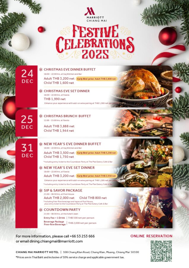 Chiang Mai Marriott Hotel warmly invites guests to mark the festive season with exceptional cuisine, joyful gatherings, and unforgettable celebrations. For more information or reservations, please contact +66 (0) 53 253 666.