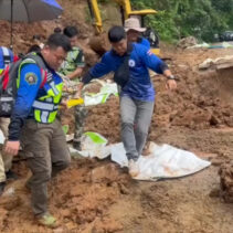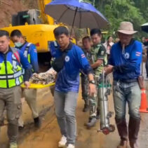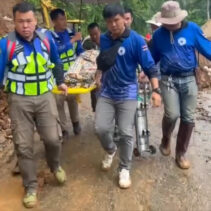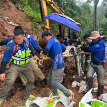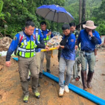 Over 200 metres of road were covered in mud along the Muang Khong-Chiang Dao Road. Rescue workers helped to stabilise here by offering first responder treatment before carrying her over the mud to a waiting vehicle. She was delivered without harm to Chiang Dao Hospital.