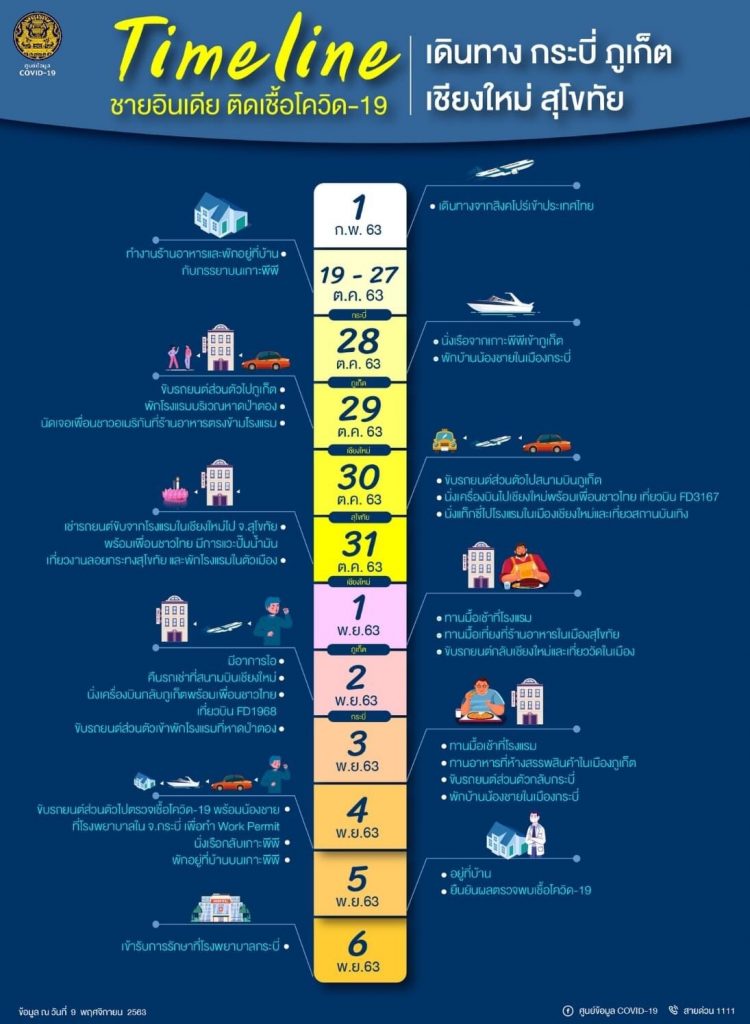 The Public Health Office Chiang Mai are reporting follow-up information after a 37 year old Indian man who came to Chiang Mai between the 30th October and 2nd of November was found in a Krabi airport to have contracted COVID-19.