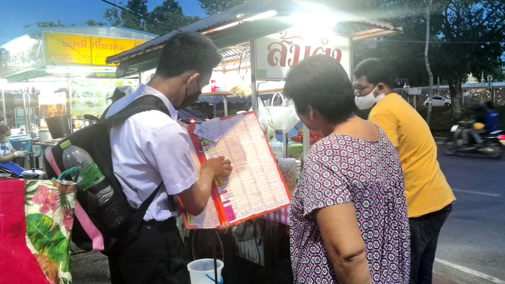 An 18 year old boy, Mon-Ong Lungsam, currently studying in Mathayom 6 of Yupparaj School, told reporters that he lives with his mother and step father in Saraphee. His mother used to work as a housekeeper but her diabetes and high blood pressure combined with the lack of work over the pandemic, has forced her to stop working. His step father has also lost his job, which used to be daily labour, and Mon-Ong has had to pawn his motorcycle in order to buy lottery tickets to sell. He fears that his lottery sales won’t cover his educational costs, as right now the family have barely enough to eat.