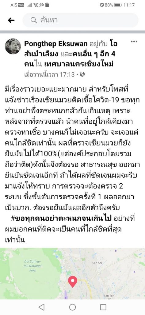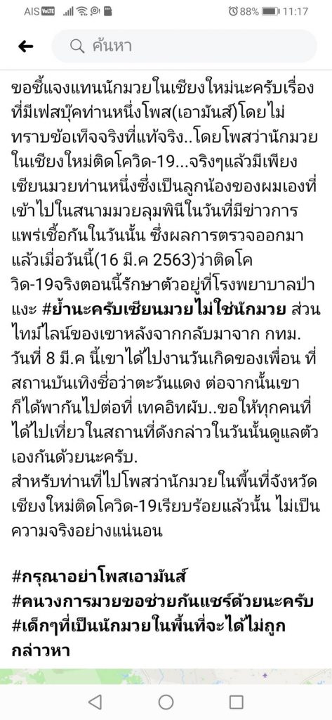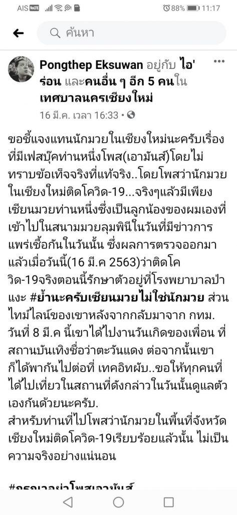 “I just want to clear things up that rumours that a Chiang Mai boxer caught COVID-19 from Lumpini station is not true. The man who did catch it is in fact a boxing fan from Chiang Mai and not a boxer, he is a friend of mine who went down to the match as announced. He returned to Chiang Mai on the 8th, after which he went to Tawan Daeng for a friend’s birthday and is now undergoing treatment at Pa Nga Hospital. I am making this announcement on behalf of the boxing community here in Chiang Mai, none of which have the virus as far as we know.”