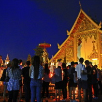 There were four main temples with major activities including Wat Phra Singh, Wat Chedi Luang, Wat Phra That Doi Suthep and Wat Srisoda. Numrous Buddhists turned up in white garments and held incense sticks, flowers and candles as they walked, clockwise, around pagodas three times in worship.
