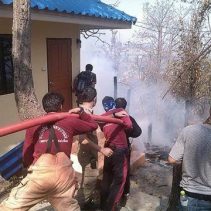 On May 10th at 3pm there was fire near the rear of Wat Phra That Doi Kham, Mae Hia. Authorities were alerted and three fire trucks were sent in local municipalities as well as a helicopter working in the skies to combat the fire for an hour. Ruamj Jai Foundation also sent in a team of volunteers to support the fight. The fire is now under control and the damage is estimated at around 400,000 baht since one of the guti (standalone monk’s residence) was burnt to the grounds. No one was harmed in this fire and authorities have speculated that it was caused by those burning the forest to gather for food.