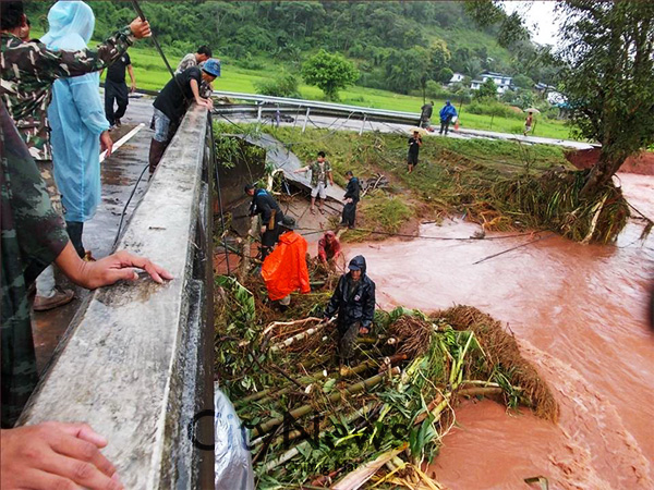 Soldiers were called to help fix the Bandan-Boklua road no.1081 (km 110+850) and make it was useable for cars and pedestrians. Villagers also helped to prepare for the heavy rains, including laying sandbags in vulnerable areas and dredging the river.