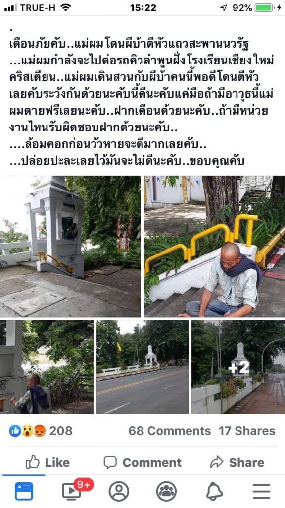 On August 21st, Tri Suphot Komsuk posted a warning on Facebook about a homeless man who allegedly attacked his mother near Nawarat Bridge. He explained that his mother was waiting for a songtaew when she encountered a homeless man who randomly attacked her. He was relieved that the man did not wield a weapon, otherwise the situation might have gone worse. Police are urged to look into the matter.