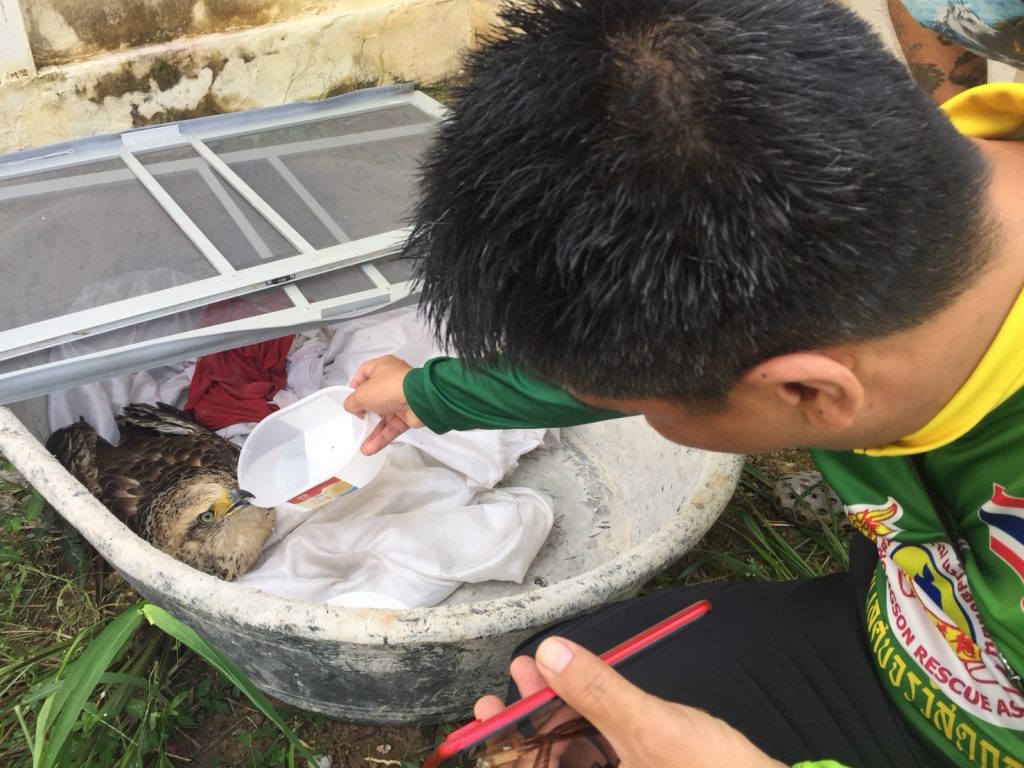 CityNews – 30th October 2019, staff in Nong Harn administrative office received a report from Napaphat Ngenchan who lived in Nong Harn area that he had found an injured eagle in his compound. The eagle had a wound on its wing and refused to take food.