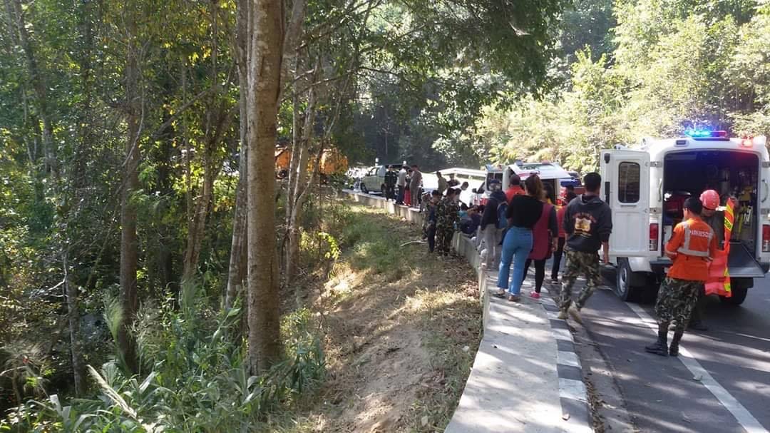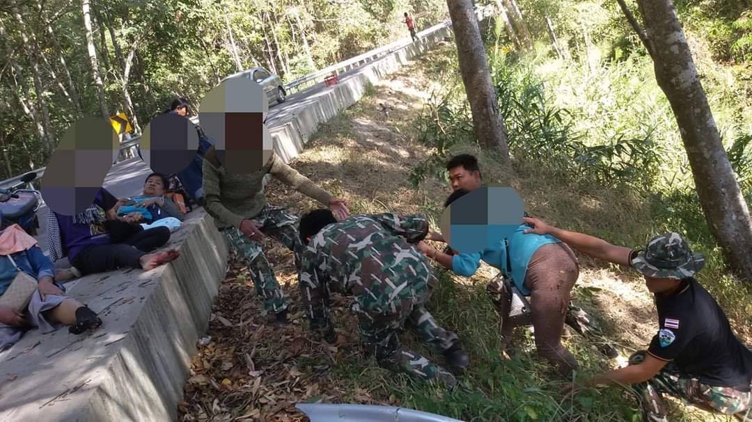 The mini van was from Khon Kaen province and had 11 passengers including the driver. Upon arrival, police saw that the van had crashed over 10 metres down a ravine, but while there were some injuries, no one suffered from serious harm.