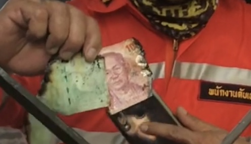 Fire fighters entered the house to find the entire structure burnt to cinders. However, there was a moment of excitement when two banknotes were found to be relatively untouched. While both notes were singed, the face of King Rama IX remained unblemished. The bank notes are to be kept and there is already talks of a miracle.