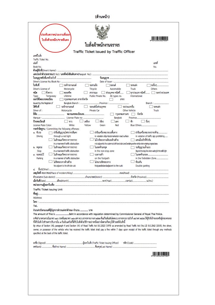 The new traffic tickets will contain English translations and barcodes which will allow motorists to pay fines at branches of Krung Thai Bank with Police Ticket Management (PTM) booths.