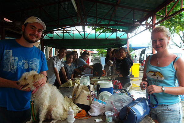 A networking of resources has brought these three dog-welfare groups together to find a solution at Wat Nong Phrae Krang and to further educate the students of NIS TAP on how to run a successful community service program. Based on Hand to Paw’s years of experience running a student-led temple dog program in 7 temples, Joy was able to provide valuable information on how to organize an effective care-giving day at the temple and vaccinate the puppies and dogs to keep them free of disease and rabies. Care for Dogs was on hand to educate the students and monks on how important it is to spay and neuter animals. The adult, female dogs were collected to have them sterilized, thus preventing future puppies being born at the temple.