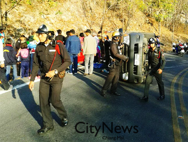 Citynews – February 22nd, around 8:30 a.m., Phuping Police Department received a call informing them that a pickup truck had turned over near Wang Buaban Waterfall on the Doi Suthep Road. 28 people were injured, and immediately rushed to hospital.