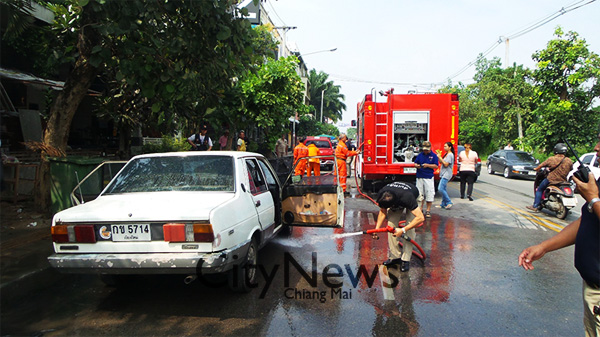 CityNews – On 7th October around 2 p.m. Chiang Mai Fire Rescue Team were called to the Royal Peninsula Hotel not far from JJ Market, where a car was fire.