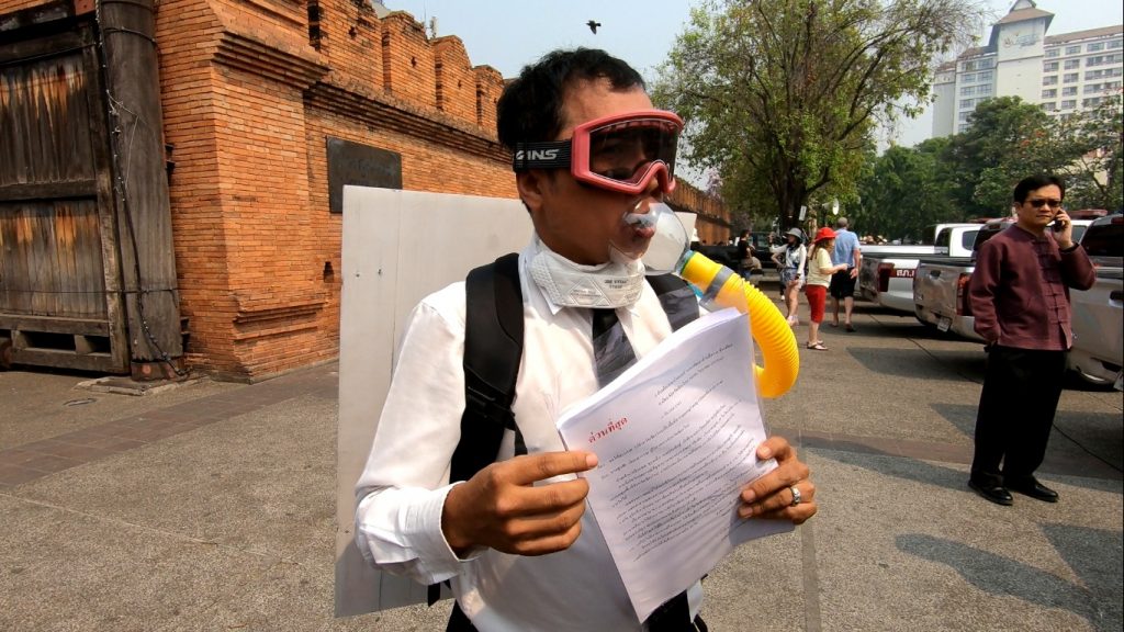 On March 16th, at an official event to launch a fire fighting and haze prevention unit, a student showed up wearing an oxygen mask with a board on his back revealing his statement on the air pollution crisis. Threerapon ‘Khun Muen’ Laipradit, a first year student at Chiang Mai Rajabhat University, stated that Chiang Mai has been facing particle pollution issues for weeks with no signs of reducing the problem, a problem which will have negative impacts on a massive scale, both economically and physically. He emphasised that this issue causes many illnesses, that force citizens to bear extra medical costs. He raised specific concerns regarding children, who have breathing rates faster than adults, as well as pregnant women whose children can face cognitive learning issues due to the haze.