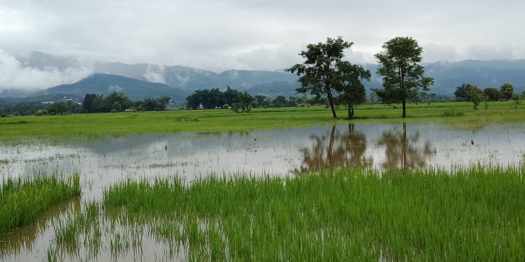 Due to the continue downpour since October 3rd, over 200 households in Mae Sao, Mae Ai District are suffering from mudslides with over a thousand rai of paddy fields damaged, according to today’s report. Mae Sao Irrigation Office has sent 500 logs to support the damaged residences, and sand bags to block the water by a destroyed bridge with a backhoe truck assigned to fill in the dirt.