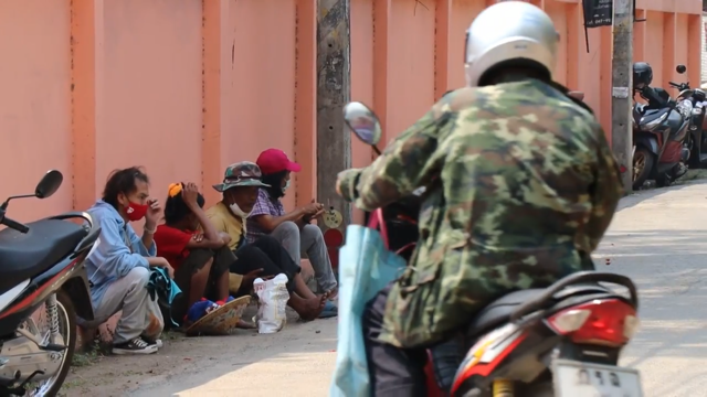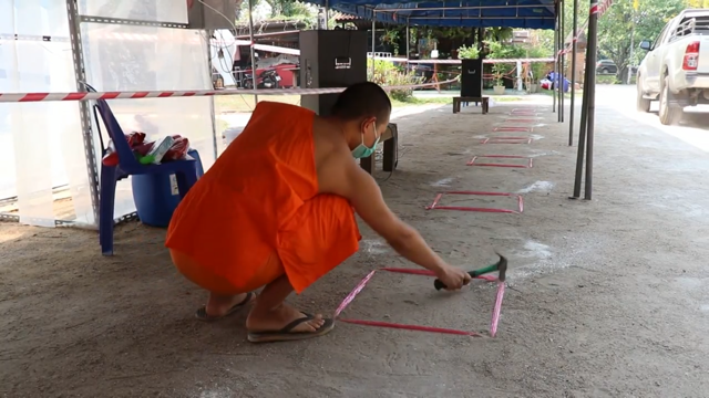 At Wat Lok Molee temple a food station has been set up and social distancing prepared including marking places in line, spraying disinfectant around the temple and taking all other preventive measures.