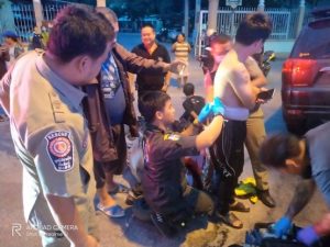 Police arrested a homeless man for attacking a stranger who was talking on the phone on Chang Phuak Road, near Chang Phuak Residence. According to police, a 45 year old man who was walking down the road had stopped to make a phone call when he was suddenly stabbed by a cutter knife in the ribs through his back. A drunken 38 year old man was detailed and arrested. Police say that this man had been