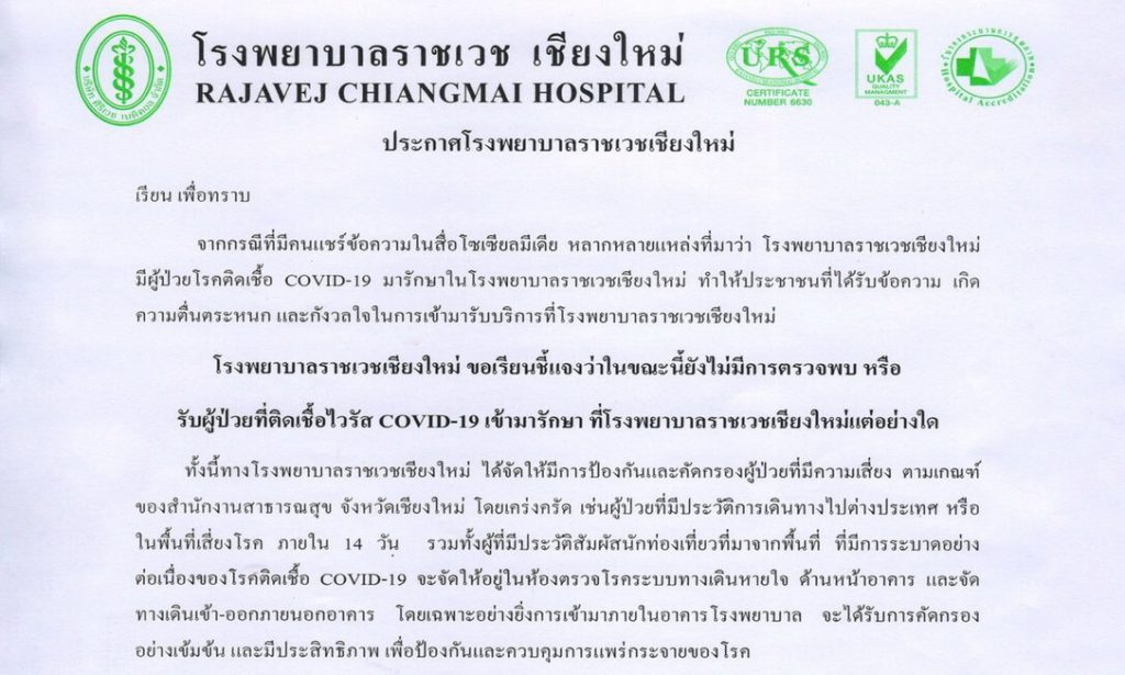 CityNews – 28th February 2020, following rumours and many social media posts about cases of COVID-19 found at Lanna Hospital, the hospital has come out to officially announce that there have been no such cases. Rumours, according to the hospital, have gone so far as to say that the hospital is telling people to buy up food and necessities in preparation for an immediate epidemic. All of this,
