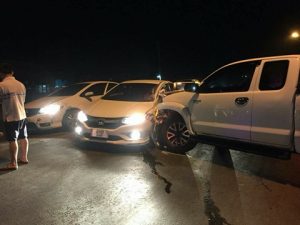 Four Car Pile Up in Chom Thong 27 March 2018 A four car pile up occurred in front of the Ban Tha Kam Nuea Community Health Centre, Jomthong, on the night on March 24. Four Car Pile Up in Chom Thong