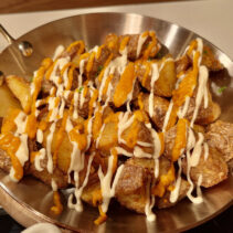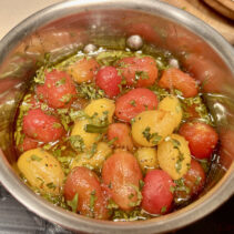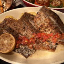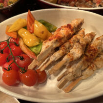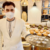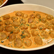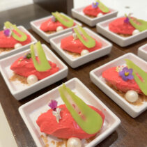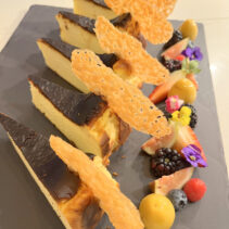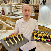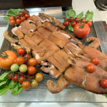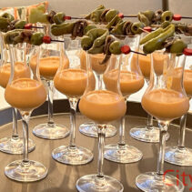 Menu includes: Tapas & Pinchos (Cold): Gilda, Salmon Ceviche, Sopa Salmorejo (shot glass) / Ensaladas: Beetroot & Orange Salad, Organic Salad Bar, Dressings, EVOO, Vinagre De Jerez Reserva and Condiments / Hot Dishes: Gambas Al Ajillo, Pinchos Morounos De Pollo. Albondigas, Lubina Con Pil Pil, Escallvada Vegetables Cherry Tomato Confit, Fillet Peppers, Patata Bravas / Carving Station: Suckling Pig / Dessert: Candy Cherry Tomato, Sweet Tomato Mousse, Seasonal Fruit Basket and Platter / Whole Cake: Basque Burnt Cheesecake.