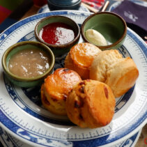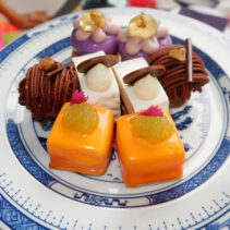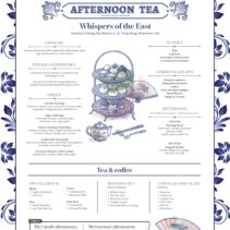 On the menu: Savoury shrimp and truffle shumai with truffle vinegar pearls, egg custard and soy caviar tartlets // Marinated minced shrimp on sesame brioche with ginger cream // Gua bao bun with Moo Hong pulled pork, poached anise peanut and pickled garlic pearls // Orh Nee Pae Kuay (sticky rice mousse, taro cream, taro mouse, ginko, osmanthus-oolong tea jelly, sable Breton). Sago Cantaloupe (Canteloupe mousse, cantaloupe gel, tres leches cake, sago pearls), Chinese Red Date Mont Blanc (Chinese red date cream, Chinese red date parfait, filo with Chinese red date and chestnut), London Fog Cheesecake (Early Grey tea cheese cake, caramel Earl Grey ganache, croustillant chocolate, fog glaze). Fortune & Whispers Tuile Cookies (Almond tuile cookies, edible wafer paper)// Scones with Goji berry, Devonshire clotted cream, local preserves and jams // Sorbet & Gelato: Moutai & raspberry, Chiang Mai strawberry, lychee, dark chocolate & ginger, Royal Thai tea, Mango & coconut.