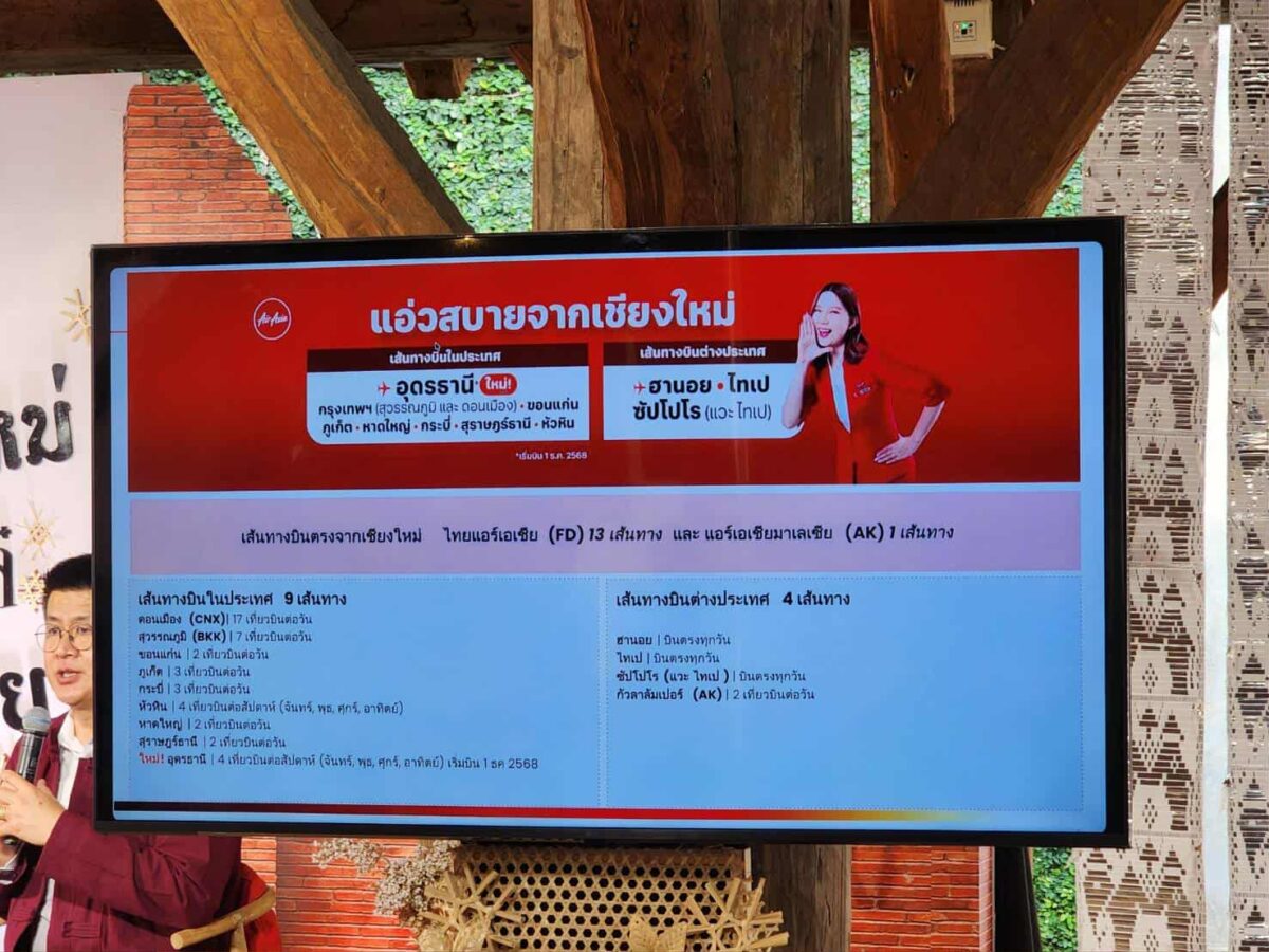 AirAsia also operates four international routes from Chiang Mai — to Hanoi, Taipei, Sapporo (Fifth Freedom), and Malaysia (AK flights) — with a total of 38 direct flights per day departing from the Chiang Mai hub.