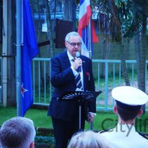 Pastor Jonathan Vickers led the service of commerations for ANZAC Day at the House of Praise International Church. Ron Elliot. This year’s event was attended by over 100 people, the largest crowd in recent years. Australian Honorary Consul in Chiang Mai welcomed the Chiang Mai Vice Governor Prachuap Kanthiya, along representatives from the Royal Thai Army and Royal Thai Police force. Australia was well represented by the Australian Defense force as well as personnel from HMAS ANZAC.