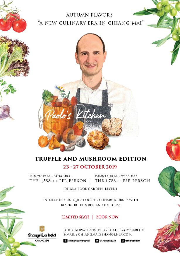 Local media were invited to the Autumn Flavors Dinner at the Shangri La Hotel; due to start next week October 23 – 27 Autumn Flavors at Shangri La Hotel – Truffle and Mushroom Edition – Indulge in a unique culinary journey and experience the goodness of autumn flavors. Treat your taste buds with the best selection of several mushrooms, such as black truffle, porcini, chanterelle, skillfully blended by Chef Paolo Pelosi with foie gras, blue crab, scallops and more. Lunch 12.00 – 14.360 hrs. THB 1,588 ++ per person (5 course menu) Dinner 18.00 – 22.00 hrs. THB 1,788 ++ per person (7 course menu) Dhala Pool Garden, level 1, Shangri-La hotel, Chiang Mai. For more information and for reservations, please call (053) 253 888 or send an email to restaurants.slcm@shangri-la.com