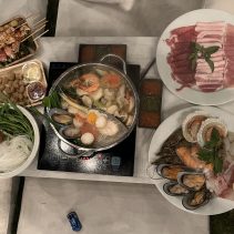 Examples of the menu include: Shabu Pork 390THB / Pork and Seafood 590THB / Seafood Set 590 THB / Delux Set 390 THB… special beer deals available