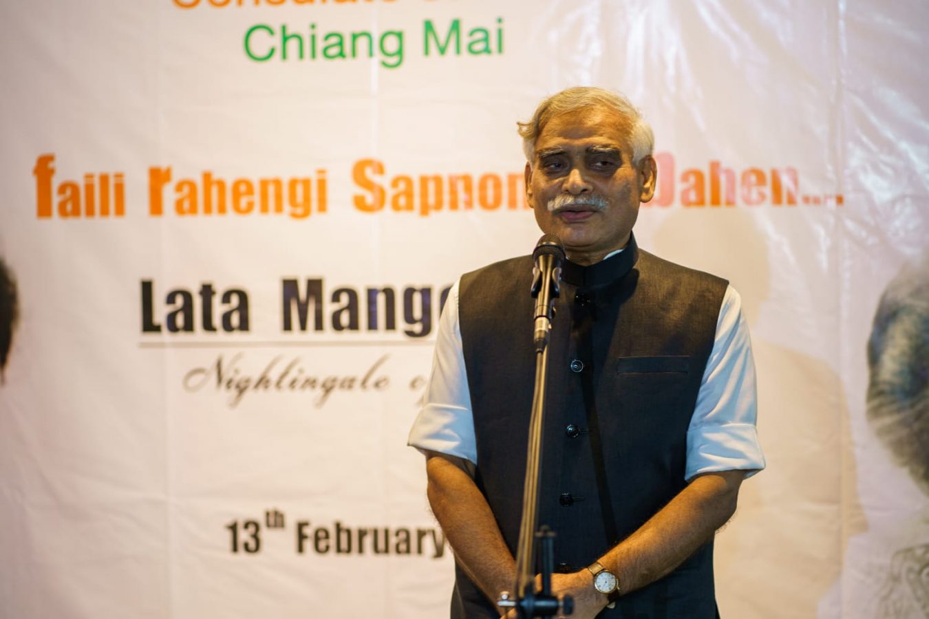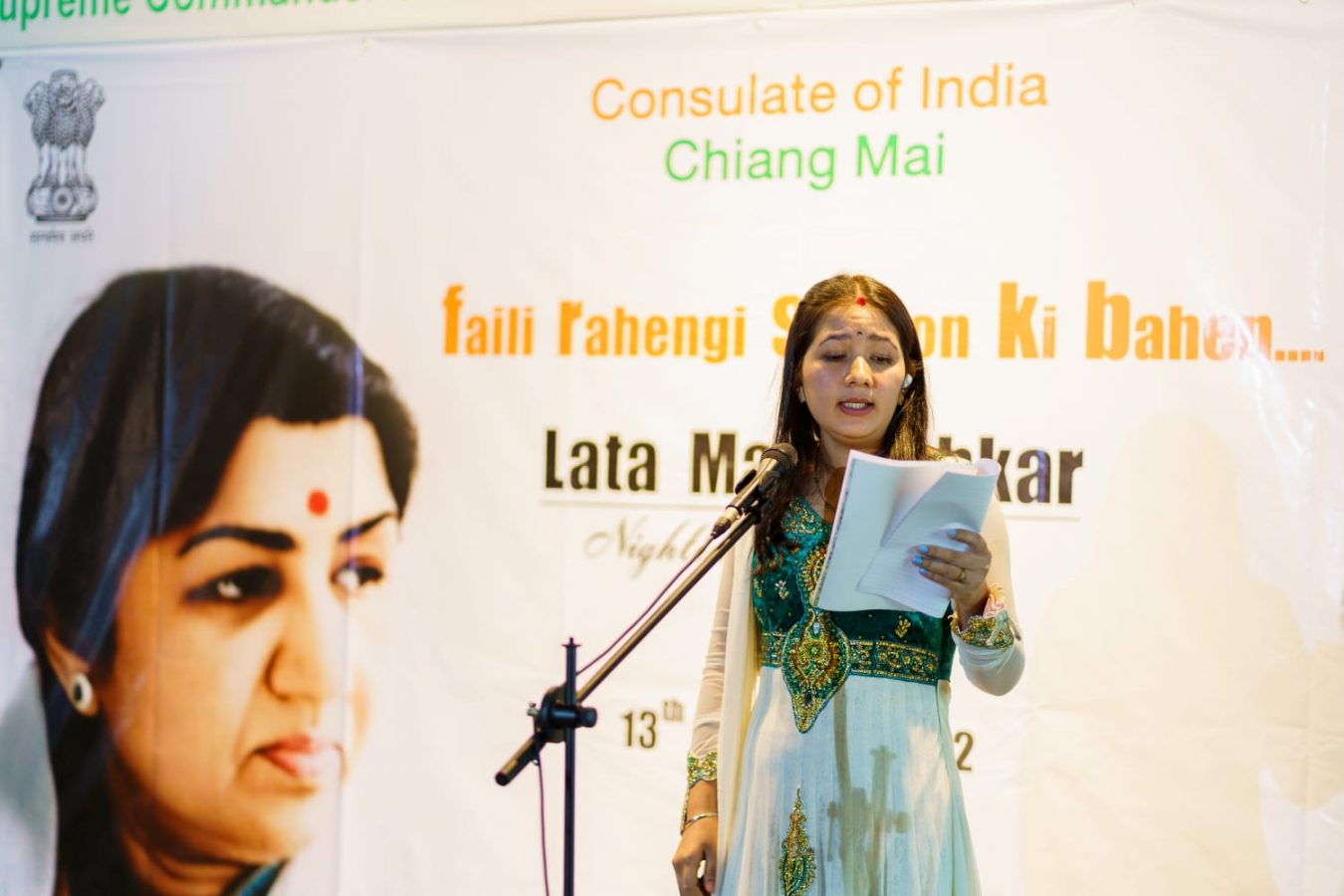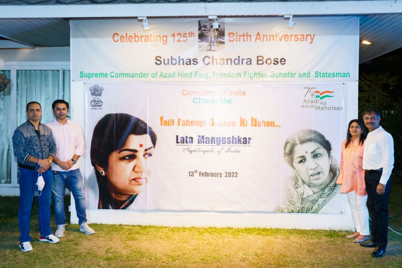 Consulate of India in Chiang Mai celebrated the life and music of ‘Bharat Ratna’ Lata Mangeshkar by holding an event ‘faili rahengi sapnon ki bahen…’. Consul Krishna Chaitanya paid glowing tributes to the singer who passed away on Feb 06 at the age of 92 by saying that with her singing she gave voice to the aspirations, dreams, imaginations and emotions of an emergent nations post-independence. Sangeeta, a new discovery, was a sensation with rendition of two of her famous songs. Shyam Arora presented a specially curated visual presentation including a life sketch of the singer, her famous interviews, and clips of her selected songs. Chai N Thai put up a photo exhibition on the singer who is regarded as “The Nightingale of India”. Earlier the Consulate had its National Flag fly at half mast as India observed two day (06-07) state mourning.