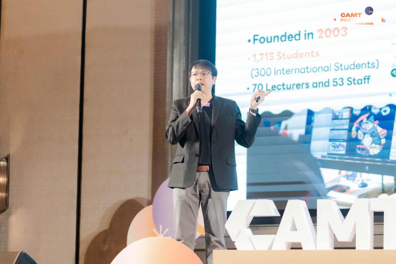 Asst. Prof. Worawit Janchai, Ph.D., Dean of the College of Arts, Media and Technology, spoke about today’s event, stating that in the digital world advancing at rapid speed, producing quality personnel who truly meet the needs of the industry sector cannot be achieved by the university as a single entity alone. CAMT is committed to creating graduates who possess both strong knowledge and sharp practical skills. Today’s activity is a precious opportunity for us to exchange perspectives from the industry’s direct experience to develop curricula that keep pace with the world and expand collaboration in all dimensions, whether in research or personnel development. I firmly believe that strong cooperation between educational institutions and business partners is the key force that will drive Thailand toward a sustainable Digital Economy.