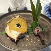 Fresh turmeric broth with scallops, lemon grass, shallot,and zucchini pearls and bird’s eye chili 290 THB