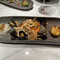 Wok fried prawns, squid and New Zealand mussels with nham yoi chili paste, citrus salt and fermented rice noodles 490 THB