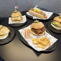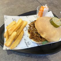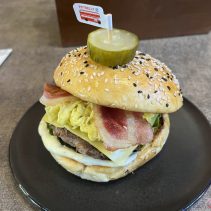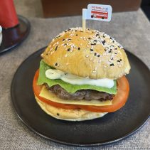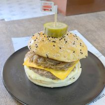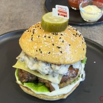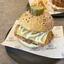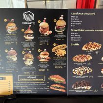 Examples from the menu: Australian wagyu beef patty, sour cream, cheddar cheese, caramelized onion 195 THB crispy burger 210 THB // Tucson pork burger, pork patty, grilled bacon, scrambled egg, cod lettuce, pickled cucumber, cheddar cheese 169 THB crispy burger 185 THB // Crispy chicken patty top with sweet pineapple, cheddar cheese, sour cream 159 THB crispy burger 175 THB // Baked spinach with ham and cheese in croissant 129 THB // German pork hocks 359 THB // Pork chop 259 THB // Potbelly chicken royal 149 THB // Potbelly flossy hot dog 149 THB // Premium pork tenderloin, stir fried in Korean hot pan with pickled mix veggies and kimchi; Dwae Ji Koki 199 THB, crispy 215 THB //Kurabuta pork in rice pork patty, top with flossy pork and stir fried pepper mushroom, cheddar cheese, pickled cucumber, sour cream; after rainy 169 THB, crispy burger 185 THB and much more besides on the menu….