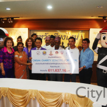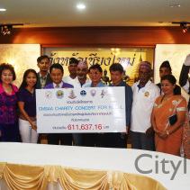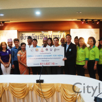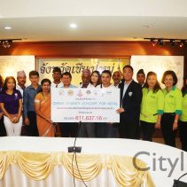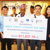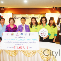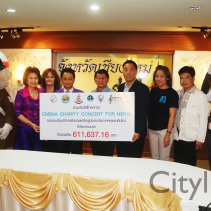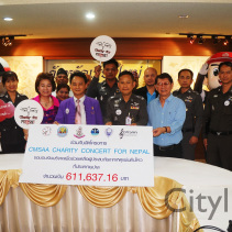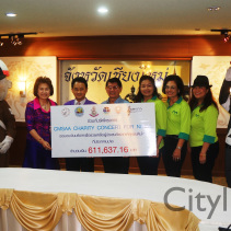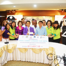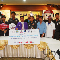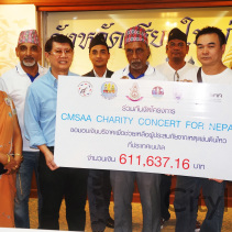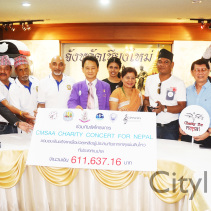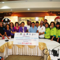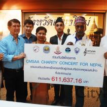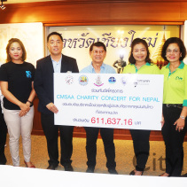 Members of the committee and supporters of the CMSAA Charity Concerts in aid of the Nepal Earthquake presented a cheque for 611,637.16THB to the Governor of Chiang Mai Suriya Prasartbandit. Four concerts at Jing Jai Markets were organised by the International We Love The King Community Organisation and The Chiang Mai Musicians, Singers & Actors Association (CMSAA)