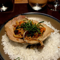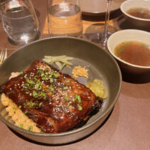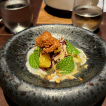Menu included: Prawn Crudo (raw prawn infused in spicy and sour mint pineapple and fish sauce) / Oyster O-Tao (deep fried oyster with grilled pork and O-Tao sauce) / Foie Gras Kapi Waan (pan seared foie gras with mango and sweeten shrimp paste) / Grilled Squid Koong Sieb (grilled giant Andaman squid with dried shrimp relish)/ Grilled Moo Hong and rice (double cooked pork rib shino Portuguese style sered with garlic dry boiled rice) / Ar-Pong & Mo Kaeng (Phuket style pancake and curry cake with salted caramel ice cream)
