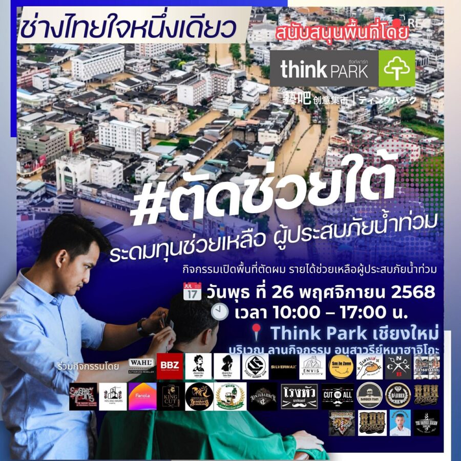 Cut for South at Think Park: Free haircuts for at Think Park by barbers across Chiang Mai and Lamphun coming together to support communities affected by severe flooding in Southern Thailand. “Cut to the bottom” to raise funds together, bring all the income of Baht. Every penny, no expense deducted, going to help those affected by the floods in the South.