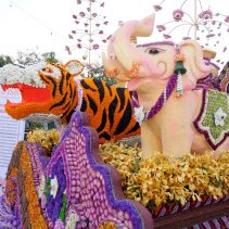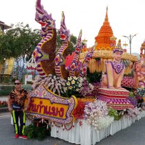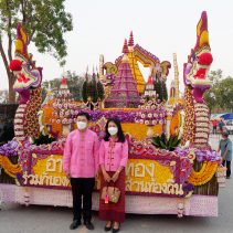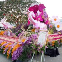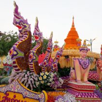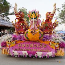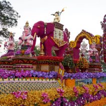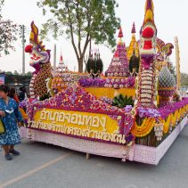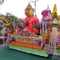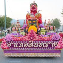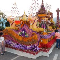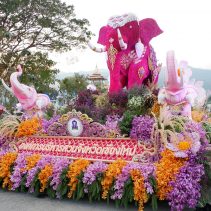 Floats at Charming Chiang Mai Flower Festival at the Chaloem Phrakiat Park, located on the Canal Road behind the City Hall. Open daily from 8am until 10pm, FREE ENTRY. The festival has many activities such as – Colorful Flower Field Festival – Flower sculptures and various flower garden arrangements various winter trees on an area of more than 27 rai / Night time illuminations / Daily Music events at 6pm, 7pm and 8.30pm / Exhibition of royally bestowed fabrics, Fabric product design contest Organizing the Doi Daughter Contest / Tropical Rain Forest and much more besides. The festival celebrates the 82nd Anniversary of the Chiang Mai Provincial Administrative Organization.