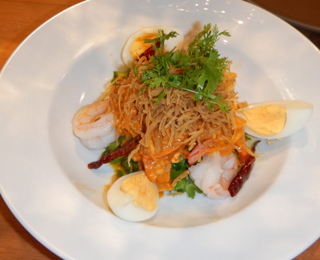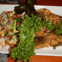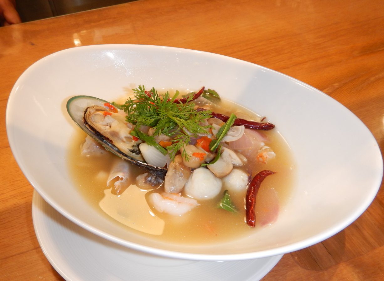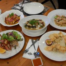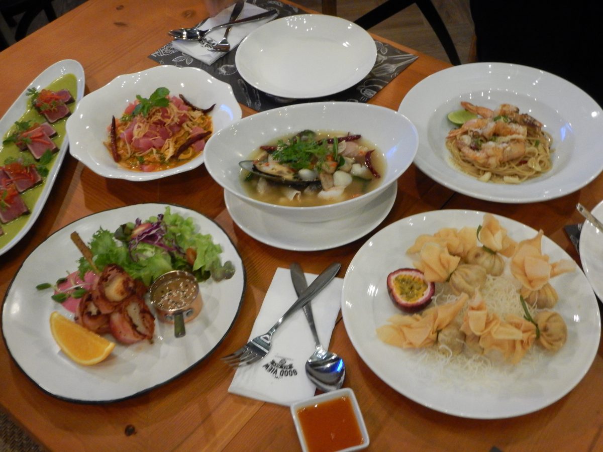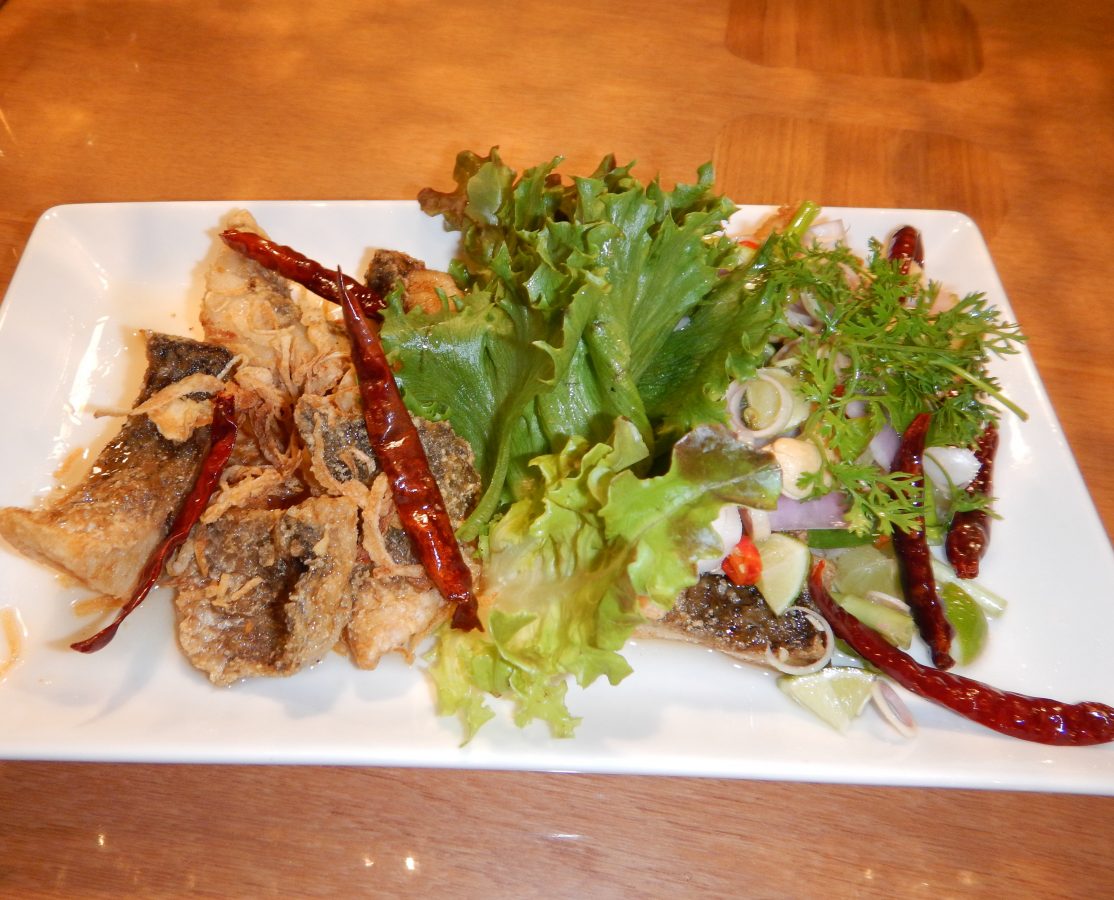 Breakfasts include Egg Benedict with Waffle 120thb / Fried Eggs served with sausages & Deep Fried Pork 120thb / Boiled Rice with Snapper 95thb. Western Main Courses include Spaghetti with ham & cheese 120thb / Baked New Zealand Mussels with Cheese 220thb /BBQ Ribs 350thb / Steak with Pepper Sauce (imported Beef) 350thb / Spaghetti Cream Salmon 210thb / Sausage Medley 240thb. Thai dishes include Deep Fried Pork Knuckle 240thb / Thai Fish Cakes 175thb / Deep Fried Sun-Dried Beef 175thb / Deep Fried Prawn Crepes 155thb / Deep Fried Turmeric Chicken Wings 120thb / Stir Fried Clams with Chili Paste 180thb ALL PRICES INCLUDE V.A.T.