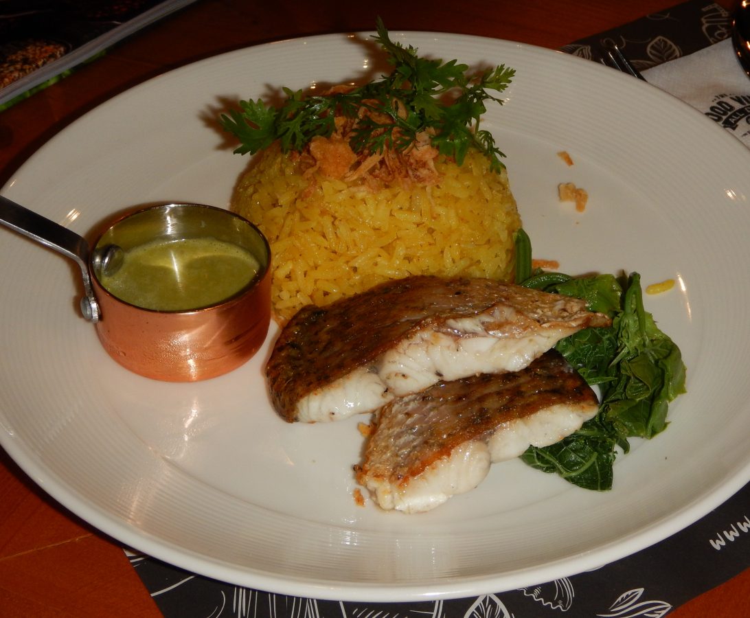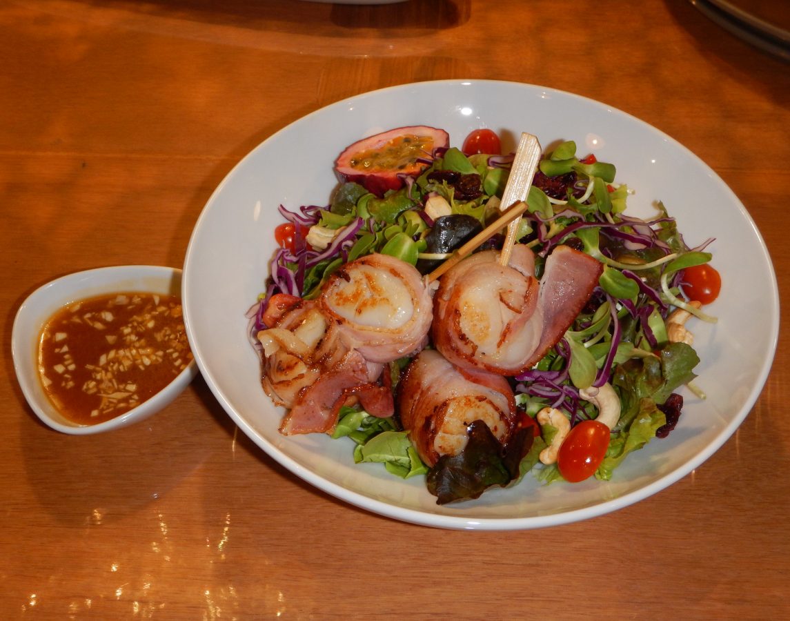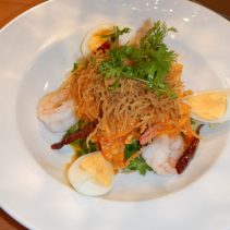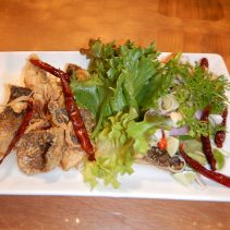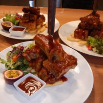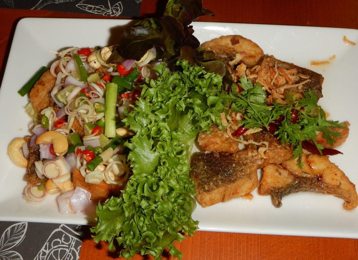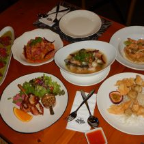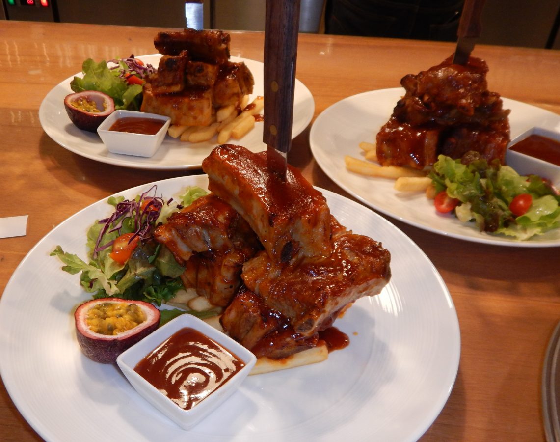 Breakfasts include Egg Benedict with Waffle 120thb / Fried Eggs served with sausages & Deep Fried Pork 120thb / Boiled Rice with Snapper 95thb. Western Main Courses include Spaghetti with ham & cheese 120thb / Baked New Zealand Mussels with Cheese 220thb /BBQ Ribs 350thb / Steak with Pepper Sauce (imported Beef) 350thb / Spaghetti Cream Salmon 210thb / Sausage Medley 240thb. Thai dishes include Deep Fried Pork Knuckle 240thb / Thai Fish Cakes 175thb / Deep Fried Sun-Dried Beef 175thb / Deep Fried Prawn Crepes 155thb / Deep Fried Turmeric Chicken Wings 120thb / Stir Fried Clams with Chili Paste 180thb ALL PRICES INCLUDE V.A.T.