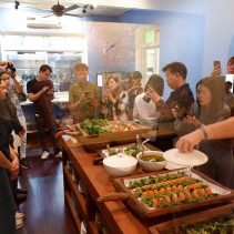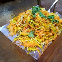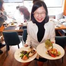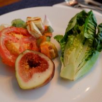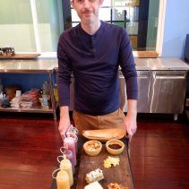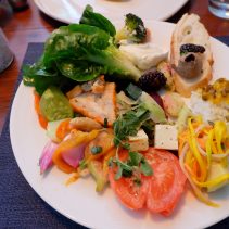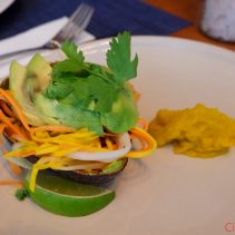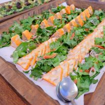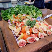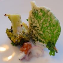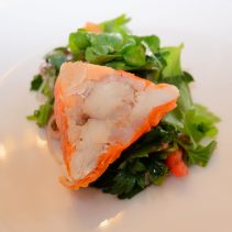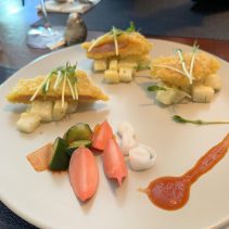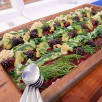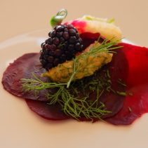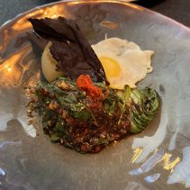 From the Farm: Poached plum wine tomato – flowering chives – ginger – avocado oil – tomato consommé – charred haloumi – pumpkin somtam – ash baked gravlax beets – ribboned dill pickled cucumber – shallot – apple tandoori broccoli – tamarind chutney – battered betel leaf – salted hung yogurt – roasted srirachai cauliflower – garlic white bean hummus – charred lemons – mulberry tart – salted egg custard : 795 THB