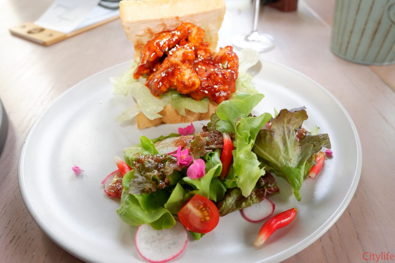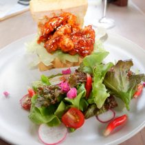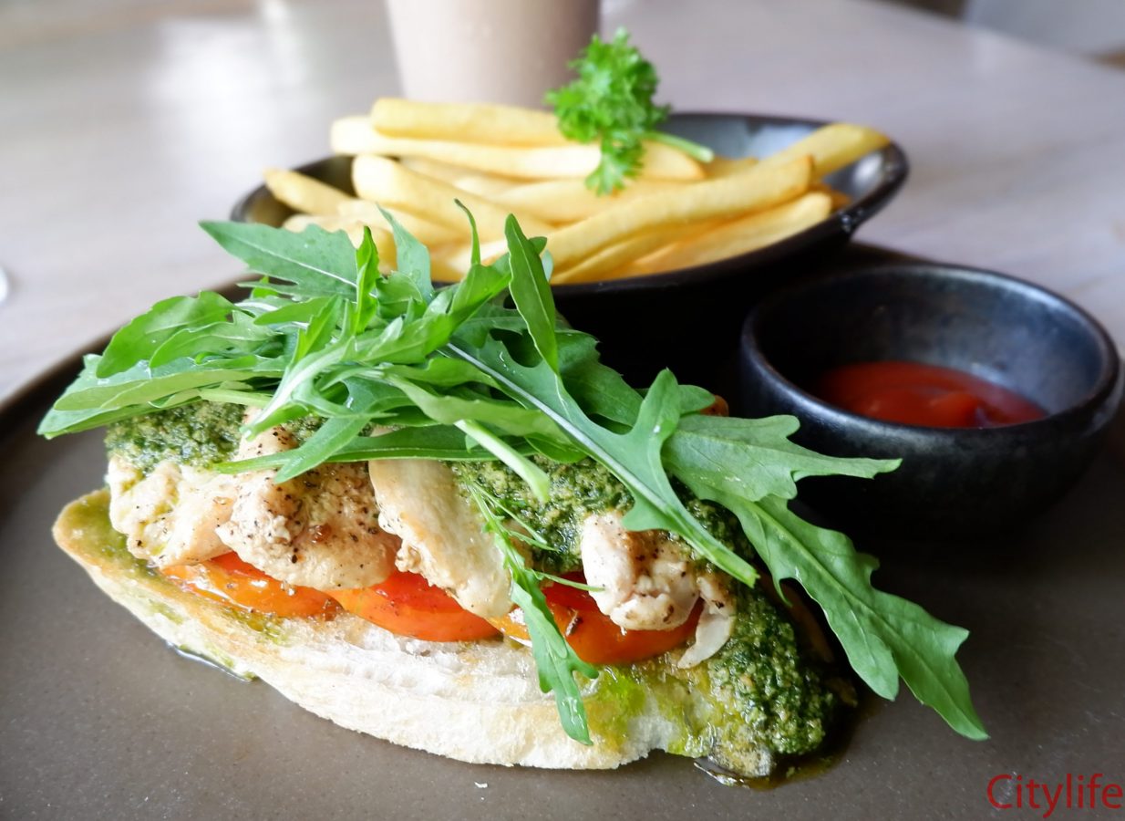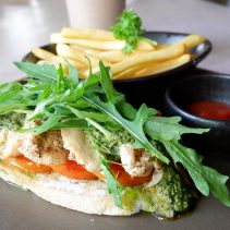 Grilled chicken with cashew nut pesto and rocket serve with mix salad 129 THB
