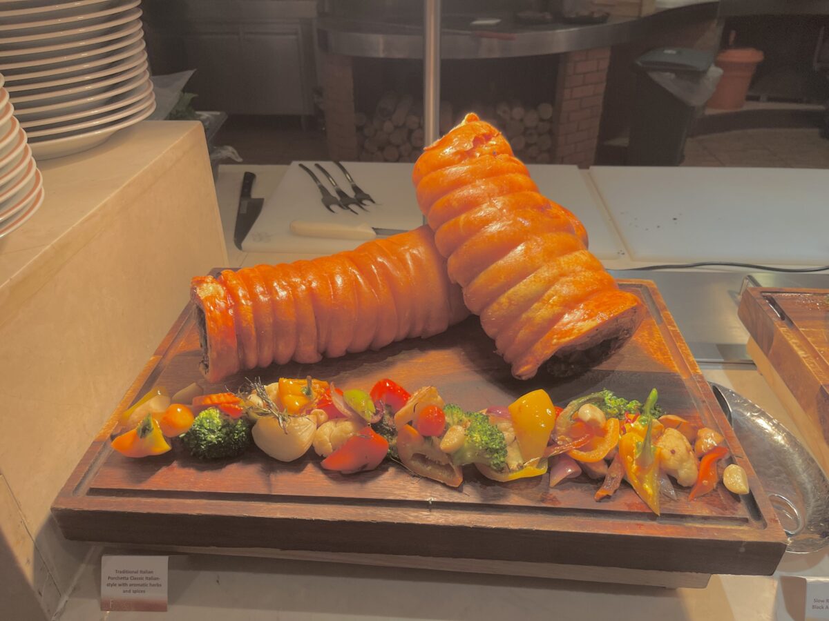 ITALIAN SUNDAY BRUNCH Egg Menu Brunch Selection •Eggs Benedict Classic • Smoked Salmon Eggs Royale •Truffle Scrambled Eggs •Poached Eggs with Asparagus and ParmesanPasta Station made to order •Penne White Beef & Onion Ragout, Pecorino Cheese Shaves •Orecchiette Broccoli, Sausage, Anchovies, Parmigiano Cheese Tagliatelle with Bolognese Sauce •Spaghetti Puttanesca Sauce with Olives, Cherry Tomato, Capers, Basil (V) /Main Course Made to Order•Cod fillet served with aromatic dill sauce •Char-grilled duck breast with orange sauce •Grilled lamb chop paired with herb chimichurri sauce -Plant-based meatballs, slow-cooked in a Classic • Nona-style recipe (V)