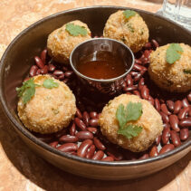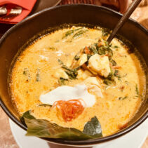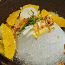 Marinated fresh cod roe wrapped with salmon served with spicy sauce: 425 THB