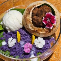 Grilled Salmon Crispy skin with lemon cream sauce and mash purple sweet potato: 390 THB
